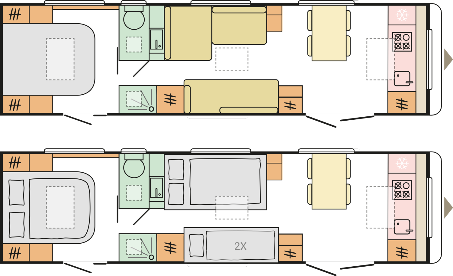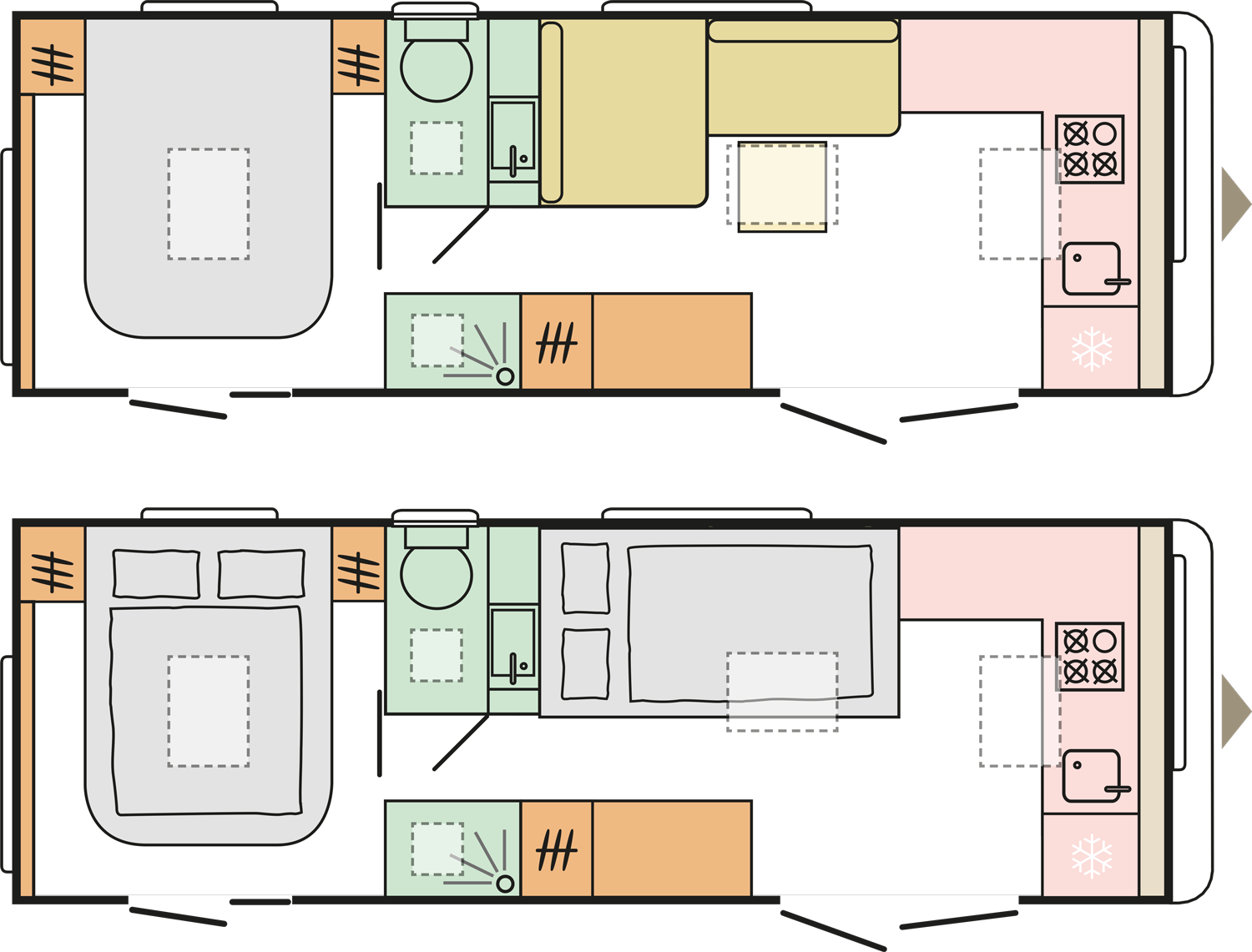 Die Küche überzeugt mit hochwertigen Geräten, einer edlen Kerrock®-Arbeitsplatte sowie grosszügigen Schubladen mit Zentralverriegelung und integriertem Mülleimer. Thetford®-Herd mit zwei Gasbrennern und einem Induktionskochfeld, praktische Dunstabzugshaube und Backofen. Der grosse Dometic®-Kompressorkühlschrank ist beidseitig zu öffnen – für maximale Flexibilität.