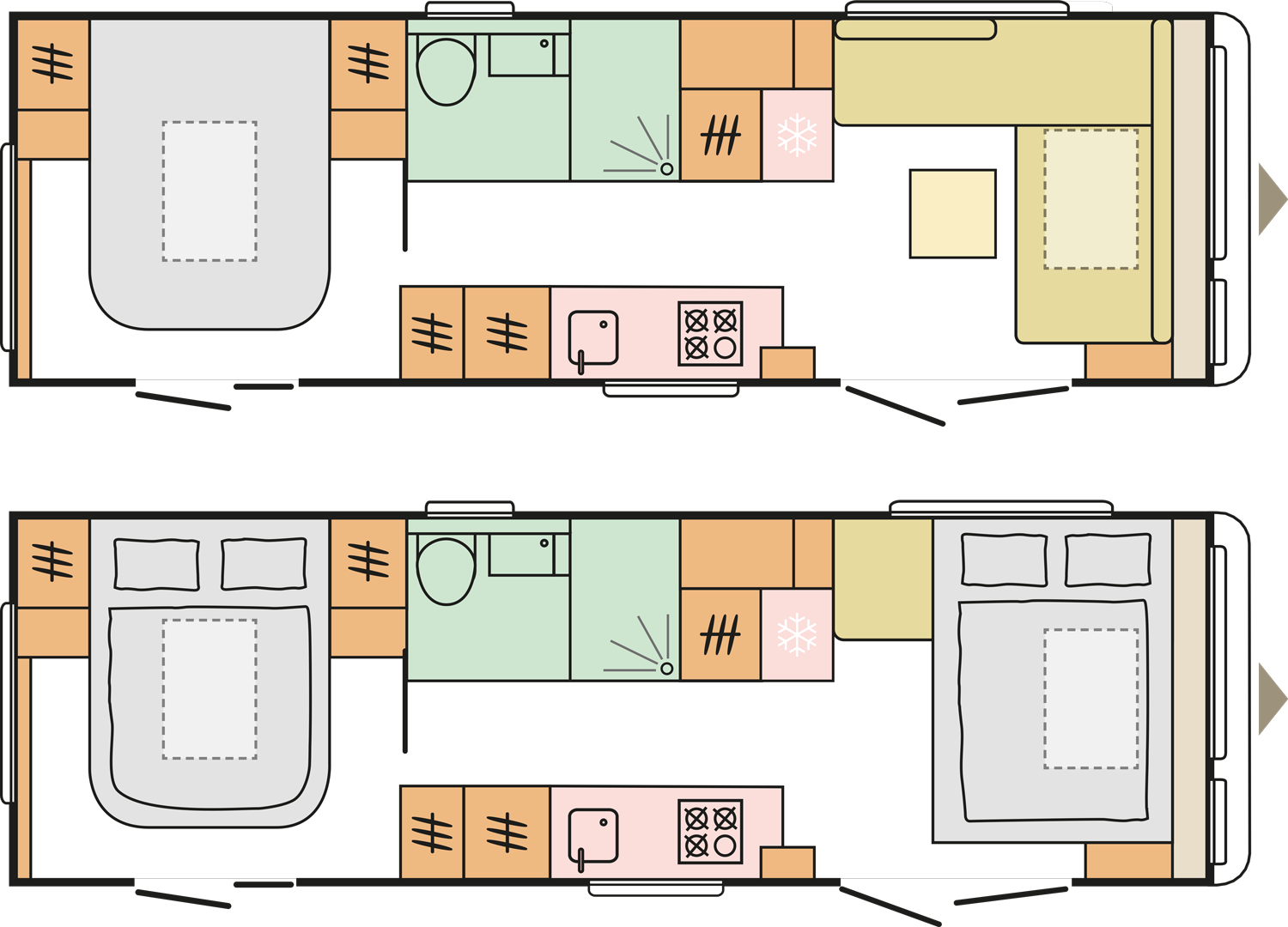 Ganzjährige Nutzung mit Alde®-Heizung und -Fussbodenheizung sowie Vorinstallation für Klimaanlagen.