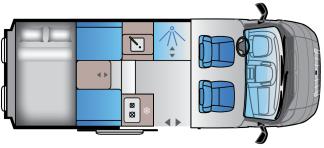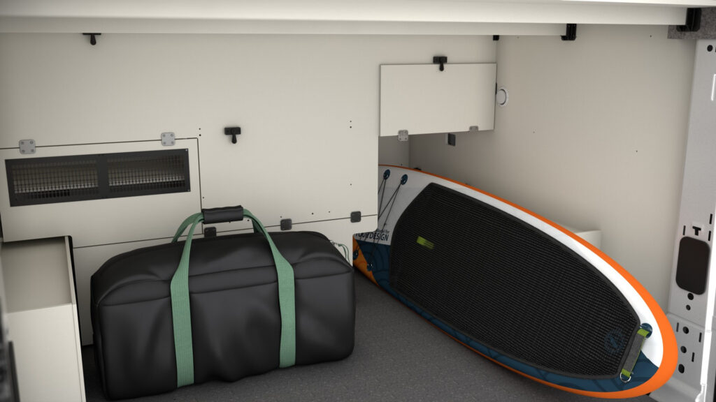 Dank der extra Innenhöhe haben auch grössere Menschen bequem Platz. Das Bad? Verschwindet bei Nichtgebrauch einfach und schafft so noch mehr Wohnraum. Im hinteren Bereich wird flexibel umgeschaltet: vom Essen oder Arbeiten zum Entspannen, Zusammensitzen oder Schlafen – mit dem festen Bett als gemütlicher Konstante. Und dank der grossen Garage hast du beim Gepäck keinen Stress: Alles dabei, alles sicher verstaut.